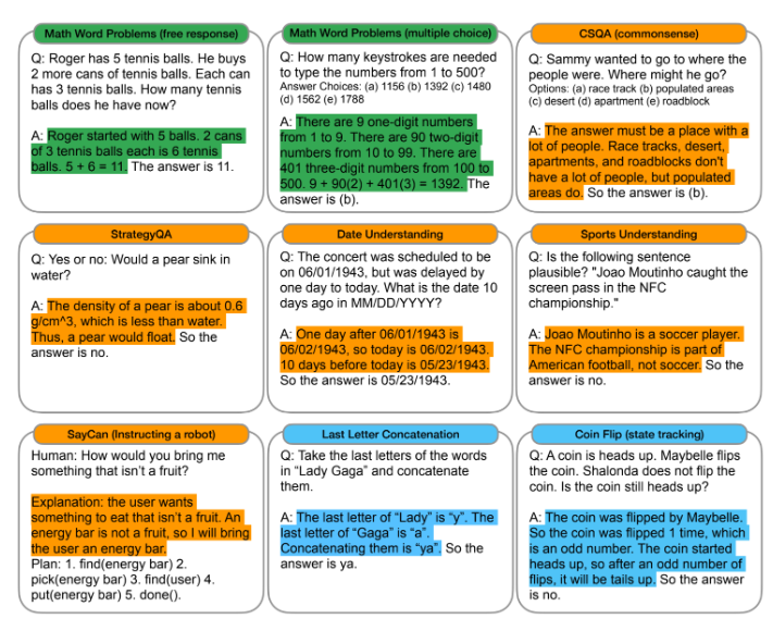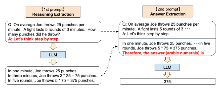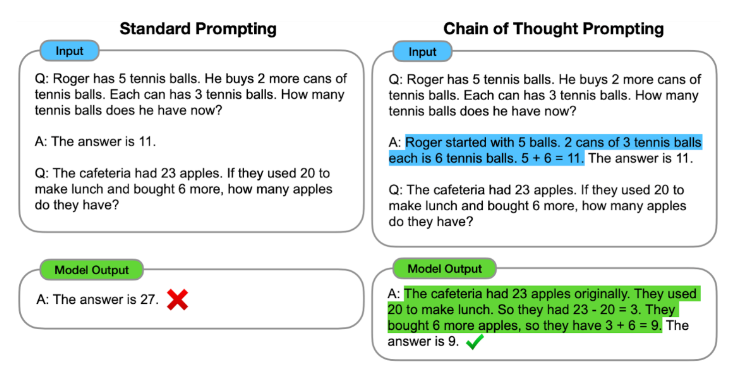 - 보다시피 답이 어떻게 나오게 되었는지 추론하는 과정을 예시로 함께 프롬프트에 제공해줌으로써 모델이 답안과 비슷한 추론 과정을 답과 함께 낼 수 있도록 한다.